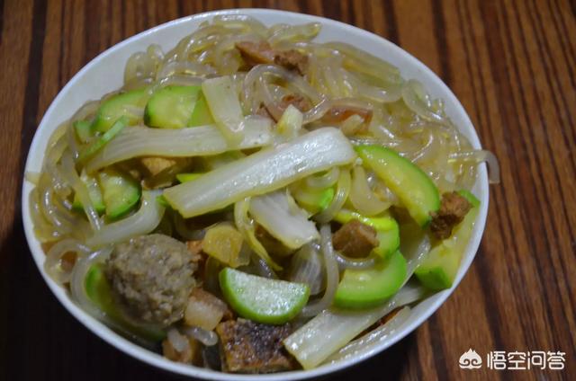 七,中午的家常炒菜。白菜粉条炖个丸子,有条件的话加点儿西葫芦等应季菜,浇面吃,太香了。