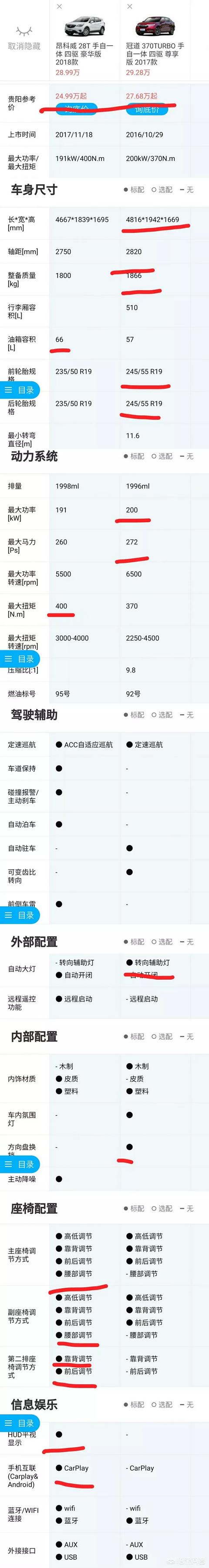 ,整体造型比较中庸,和途观一样没什么亮点,但是耐看,反观冠道,LED大灯组配合中网粗壮的镀铬饰条,加上溜背式的侧面线条,整体运动感十足,一副蓄势待发的样子。内饰的话,昂科威延续了别克一贯的豪华式设计风格,大面积的皮质包裹,相对而言虽然豪华感确实有种显性的豪华感,冠道的内饰风格豪华感不强,可是视觉效果不错,看着就很舒服。当然这种主观性强的东西不宜多说。我们来看看具体配置~~因为冠道1.5T车型也出现了机油增多的问题,所以我们直接考虑2.0T车型,好在昂科威也有2.0T车型,因为贵州地区多山路,所以还是以四驱为首要考虑吧。为了便于比较,我们以知道价格相近的两款2.0T四驱车型为例~~