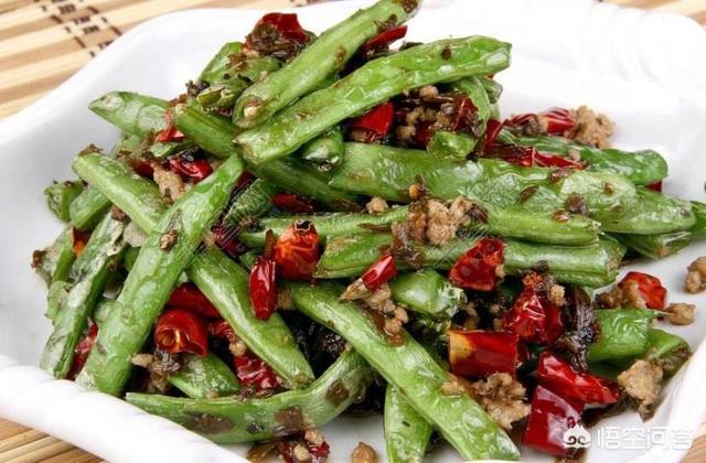 本人坚信,没有辣椒的四季豆是没有灵魂的,建议干辣椒爆香然后放四季豆肉沫爆炒,当然时间一定要掌握好,宜长不宜短,因为四季豆不熟的话会有毒素残留