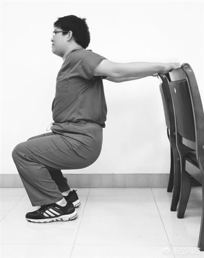 动作要领:背对椅子站立,两脚分开比肩宽,两手往后伸直并扶稳椅背。保持双眼目视前方,随后缓缓下蹲,使髋膝关节各屈曲成90度。再慢慢起立,恢复至原来姿势,重复5~10次。