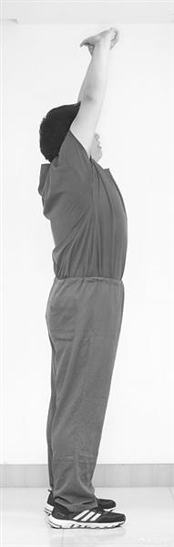 动作要领:两脚分开,与肩同宽,需保持身体直立。随后,两手在背后交握,两肩夹紧下垂,手臂带着胸部往上提升,直到自身可上升的最大限度。手臂上提时,用鼻子缓缓吸入尽可能多的氧气,放下时再缓缓呼出,重复5~10次。