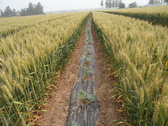 3、以2.4米为一带做畦,小麦占地1.8米,种植9行,西瓜畦占地0.6米,种植一行。小麦适时播种,每带种9行。第二年4月底至5月初在西瓜预留畦中间点种一行西瓜,西瓜播种前要开沟施肥浇水,保墒播种。小麦亩穗数应保持在37万以上,西瓜密度700株左右。小麦占地虽较平作减少四分之一,但由于其营养条件好,相对边行多,通风透光好,穗粒数和千粒重相应提高,平作小麦与间作小麦亩产相差13.9公斤,而间作地块亩多收西瓜2800公斤。