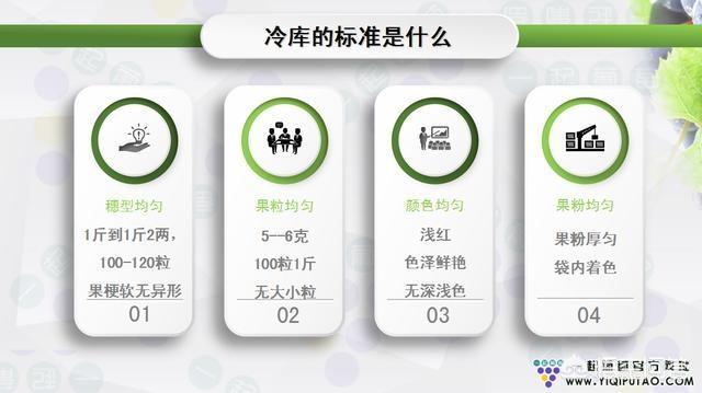 1.冷库老油子,谈经验丰富,资金雄厚,路子很广,他们是收购的主力,但他们不见兔子不会撒鹰的,必须有好货才出手,价格不是问题,质量标准超级严格。基本就是下图的标准,再加上一条底线,可能导致烂库的病害(灰霉,炭疽,破皮,蚧壳虫)。冷库老板必须认识几个,必须知道人家的收购标准,必须按人家的标准生产葡萄。否则你的收益就只能靠运气和资源了。