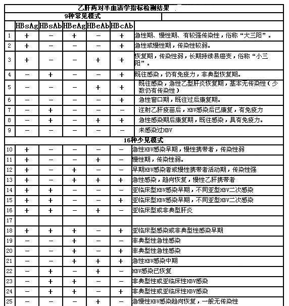 值得一提的是乙肝大三阳,HBsAg、HBeAg.HBcAb均是阳性,病毒在人体复制活跃,是一种最具有传染性的乙肝模式肝炎。下面这个图是乙肝的常见模式跟少见模式,大家可以看一下,就知道自己是什么模式。