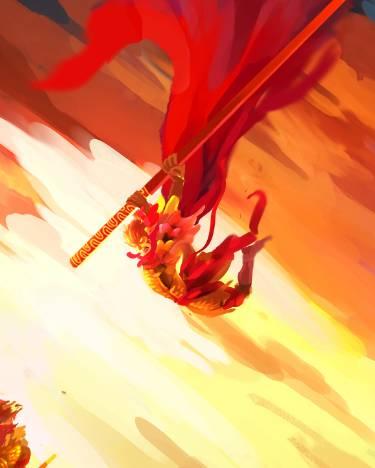 刹那间气动山河,黑暗的天空突然被一道巨大的闪电划开,孙悟空一跃而起,将他的“大棒棒”直指苍穹,"来吧"!那一刻被电光照亮的他的身姿,千万年后仍凝固在传说之中。