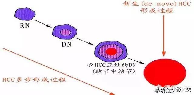 不一定!肝癌的演变要经历四个过程(下图),首先是再生结节(RN)、高级别不典型增生结节(DN癌前病变)、结节中结节、最后到小肝癌(HCC),小肝癌就是肝癌的正式形成时期(早期),慢慢长大,最后出现肝内或者全身多发转移(晚期)。