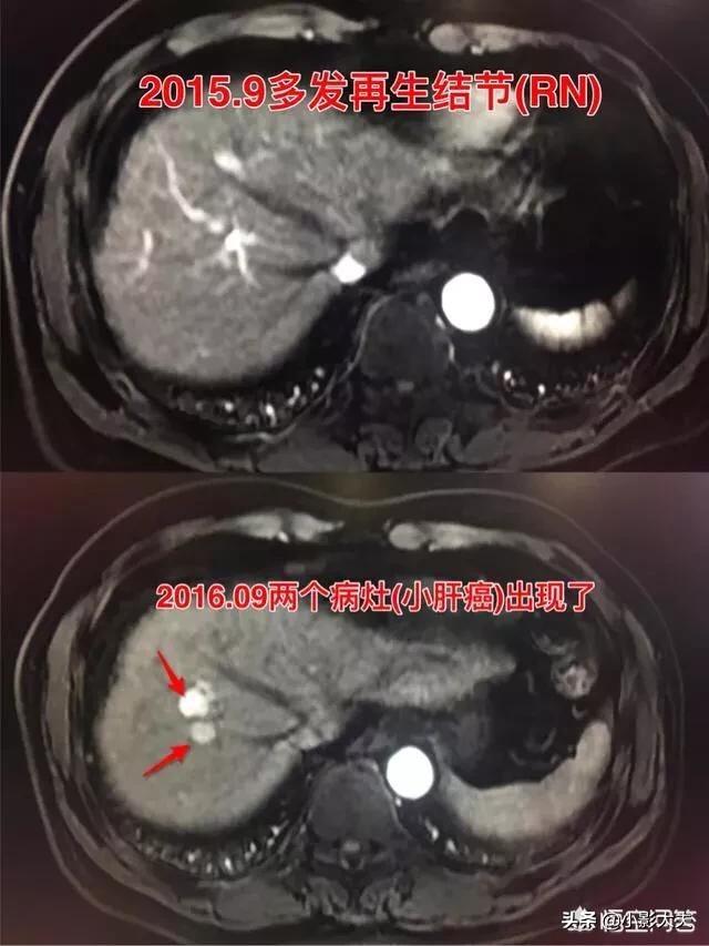 这是一位43岁男性,乙肝多年,2015年9月发现肝硬化,一年时间2016年9月,两个小肝癌形成了。
