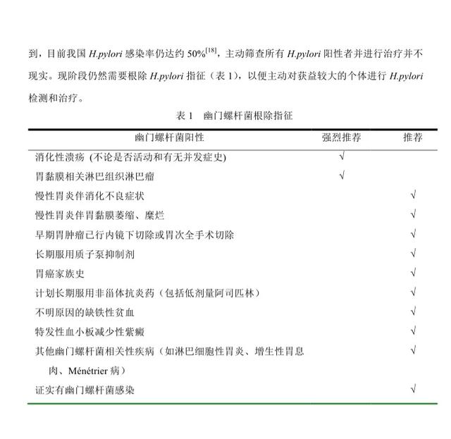 从上面的表格我们可以看到在你有消化性溃疡及胃黏膜相关淋巴组织淋巴瘤时是强烈推荐根治。最后一项我们也可以看到只要证实有幽门螺杆菌感染就建议根治。