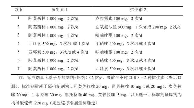 目前推荐铋剂四联(PPI+铋剂+2 种抗生素)作为主要的经验性治疗根除 H.pylori 方案(推荐 7 种方案)。