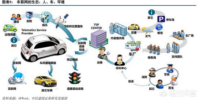车联网的生态由人、车、环境三部分组成。人是指车辆为人提供信息、娱乐等服务,同时集分析用户的驾驶行为、习惯等用于保险等增值服务。车是指车辆需要依托车联网来实现高精地图导航、超视距决策、车辆监控、车辆救援、车辆诊断、工况信息用于车辆研发、保养等。环境是指通过车联网可以搜集实时路况信息、实现不停车道路收费、道路事故监测、实时调度等。