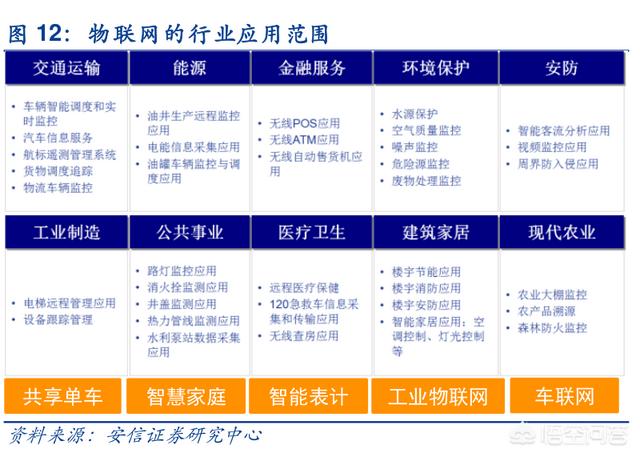 物联网产业覆盖范围十分广泛,包括十大行业应用(交通运输、能源、金融服务、环境保护、安防、工业制造、公共事业、医疗卫生、建筑家居和现代农业)和五大创新应用(共享单车、智慧家庭、智能表计、工业物联网和车联网)。