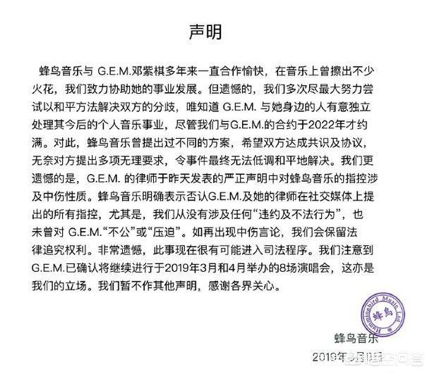 从邓紫棋通过微博晒出解约声明,我们了解到,邓紫棋宣布和合作了14年的经纪公司蜂鸟音乐解约,重点就是: 蜂鸟公司多年以来对她存在不公和压逼,在合约期满还替她接工作,此前曾多次协商无果,过往太多所作所为令她绝望,为了不影响合作方愿意配合完成8场演唱会,后续事宜交给律师处理。