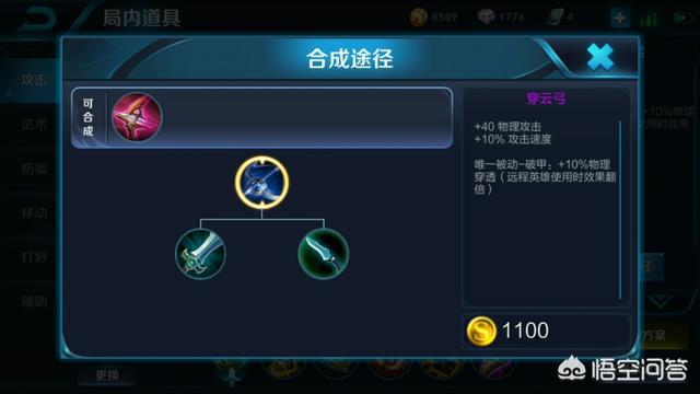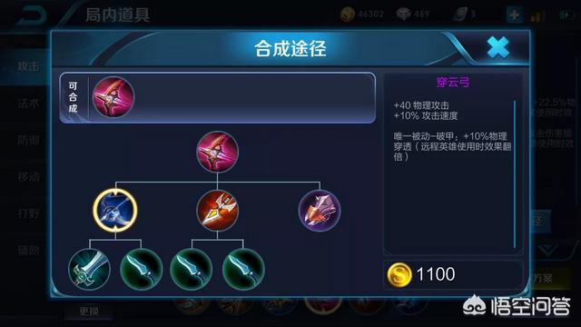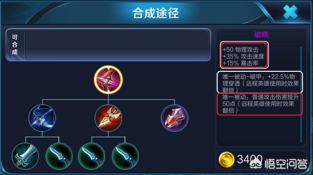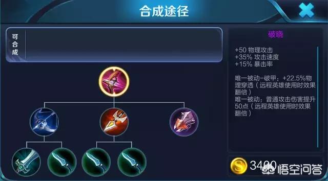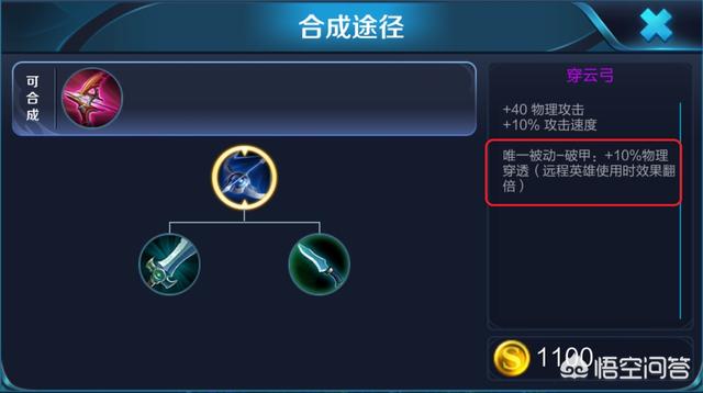 穿云弓是破晓的一个小件,1100金币,破晓来到了3400金币,这个面板属性看似诱人,实战效果并不理想。前期出无力,后期出同样无力。