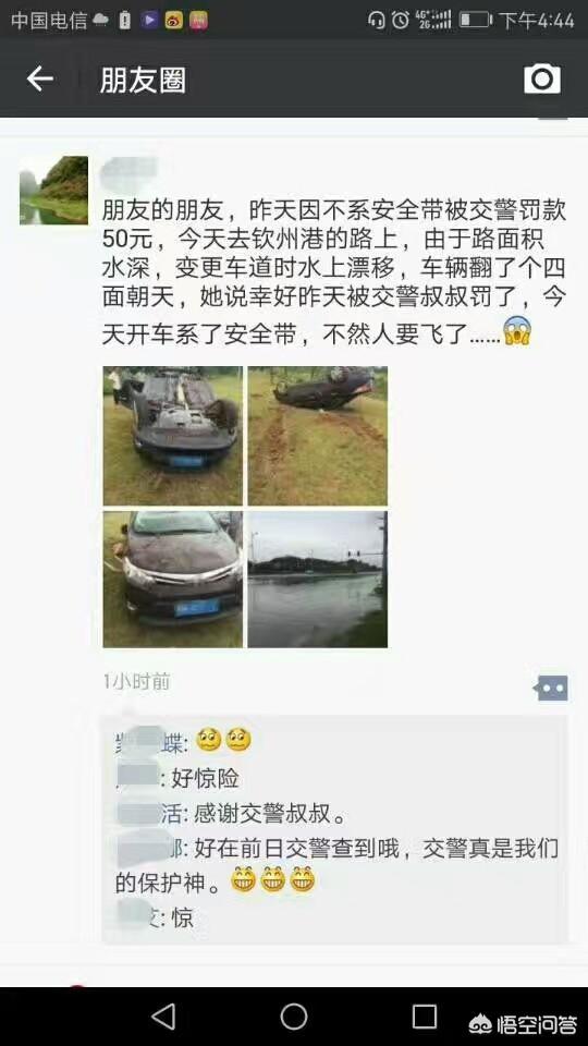 说到安全带,很多人可能不以为然。蜀黍先敲黑板!就在上个月,蜀黍处理了一起一辆小轿车由于操作不当失控侧翻的交通事故,小车由于车速过快,在撞了护栏后翻滚了5、6⭕,车身也损坏严重,几乎报废!但是车内的两人在安全带和气囊的保护下却只是擦破了一点皮。惊魂未定的两人见到蜀黍后怕的说:“幸好系了安全带,不然真是没命了。”而另外一个故事却要从一个微信朋友圈说起,一天蜀黍的同事们都在转发一个朋友圈⭕。曾经被交警蜀黍罚款的朋友,很有必要看看这一个朋友圈,其实交警蜀黍想说:转自钦州交警:罚款其实只是一种管理手段而不是目的,其实安全带真心不是系给摄像头或者交警蜀黍看的,真到关键时刻安全带就是生命带!我们只是希望用我们百分之百的努力,来消除您百分之一的侥幸,让平安始终在您身边…
