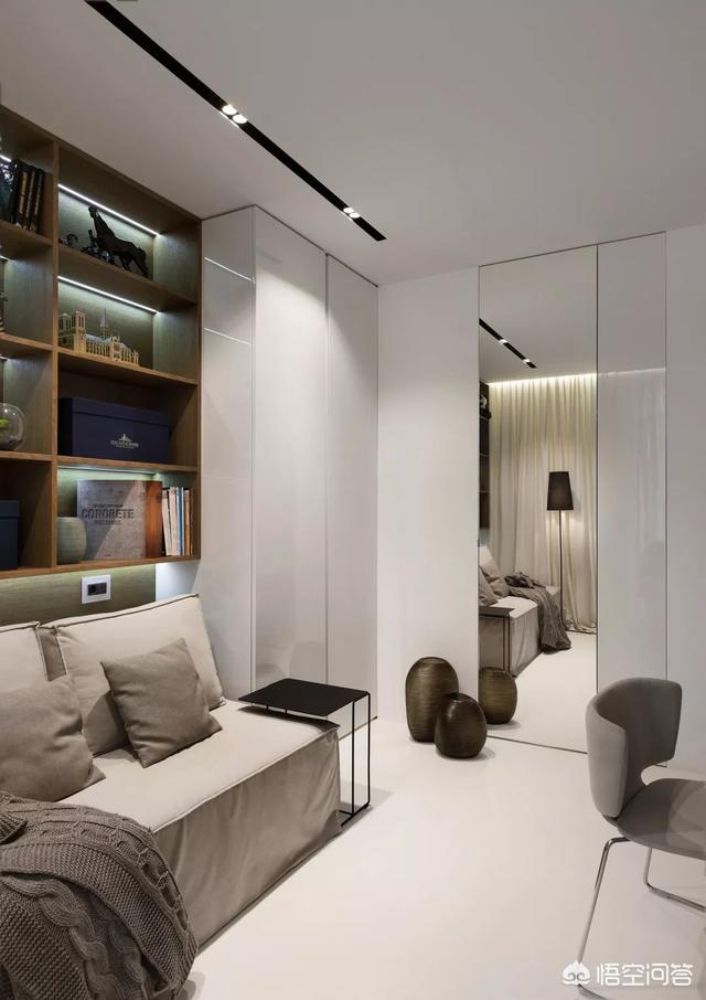 同时可以利用颜色的对比,反差,造成视错觉,让空间显大。比如在白色的房间里,使用黑色,黑色是收缩色。可以在地面使用黑色,或者局部墙面使用黑色,有拉伸空间的作用。或者是其它比白色深的颜色也可以。