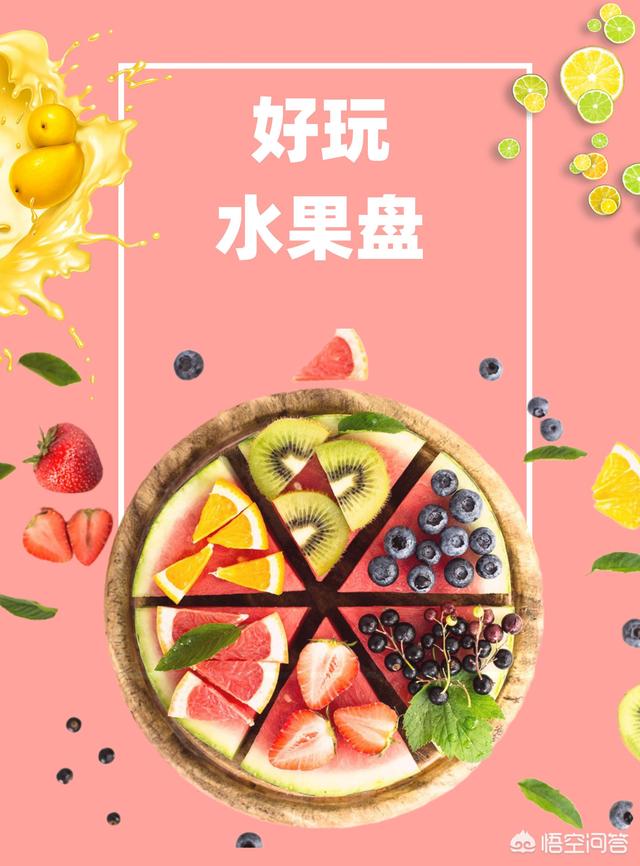 可以把各种颜色及各种形状的水果做个拼盘。把酸的甜的做个综合,在水果上涂点沙拉或酸奶。还可以把水果摆成动物卡通形象吸引小孩