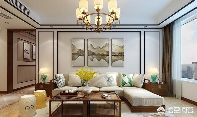 这套新中式风格装修家居空间的家具新中式韵味,但又有别于传统中式家具,背景的山水画装饰画,茶几上的茶具,白色的抱枕,柱形凳椅简单清爽还有点禅意。