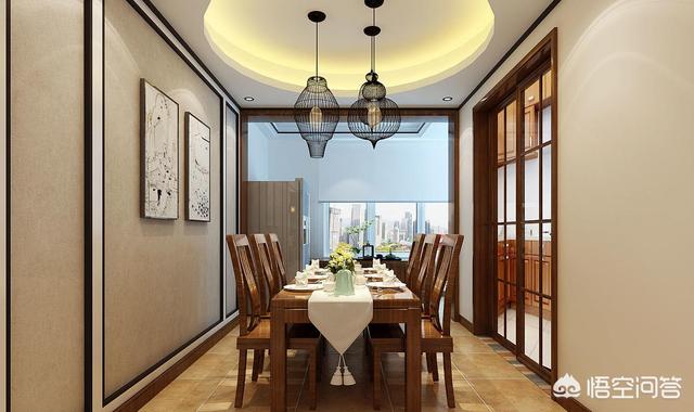 餐厅空间设计上延续了客厅的对称手法及硬朗直线条装饰,顶部采用圆形造型,搭配实木家具,旨在营造出方圆有道的禅意东方精神!