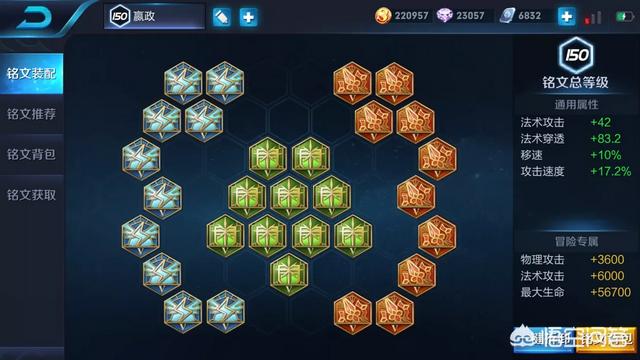 通用铭文:红色:梦魇*10:法术攻击+42,法术穿透+24,蓝色:轮回*10:法术攻击+24,法术吸血+10%,绿色:献祭*10:法术攻击+24,冷却缩减+10%而对于嬴政来说,由于嬴政普通伤害非常的高,所以增加了6%的攻击速度对嬴政打伤害会更有好处。所以绿色建议使用铭文绿色:心眼*10:攻击速度+6%,法术穿透+64,这样总属性就达到:法术攻击+66,法术穿透+88,法术吸血+10%,攻击速度+6%,王者荣耀中嬴政的普攻有穿透和法术加成,攻速的提升就提高了嬴政的输出能力。