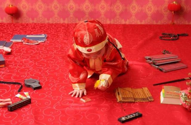 1)小孩周岁时,很多地方都有一个“抓周”的习俗,在孩子面前排开表示不同职业的器物,例如笔墨、书、算盘、钱、印章等等。小孩如果抓到书,预示着长大后会读书,适合做学者、专家;抓到笔墨,预示着会成为作家、画家;抓到印章,预示着有权势,会做大官;抓到算盘/计算器,预示着会当商人、会计师,适合从商;抓到钱币,则预示着将来会很富有。