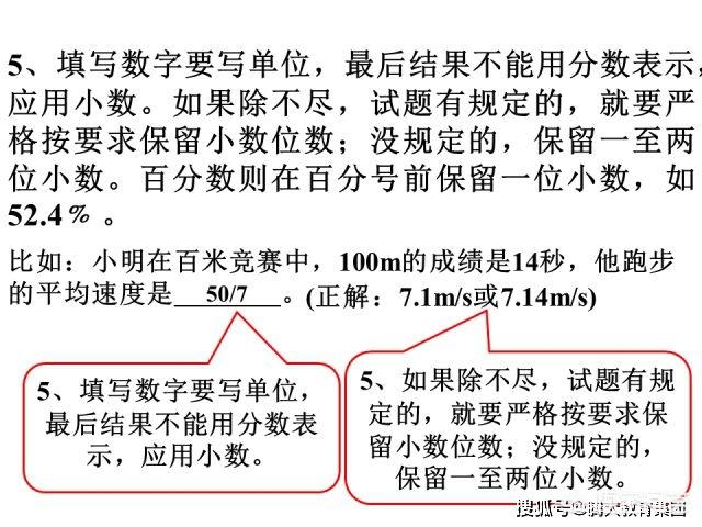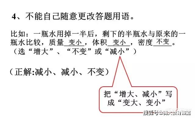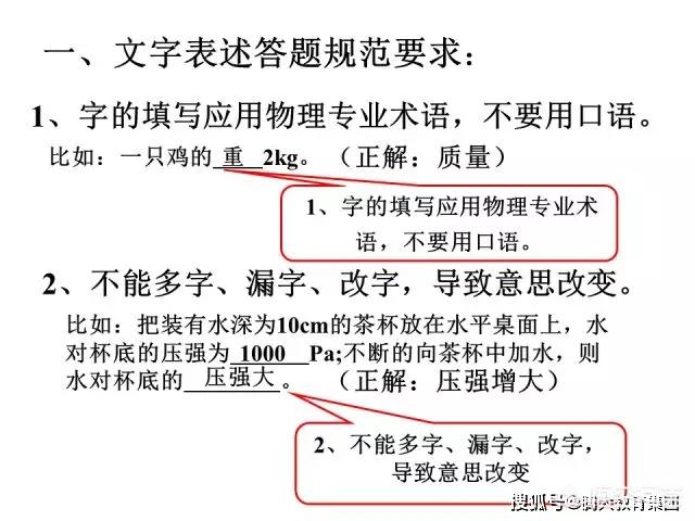(3)细节问题,俗话说细节注定成败,中考和高考阅卷,实行分步得分,因些细节就很重要。(a)结果是小数与分数。一般要求用小数表示,则必须用小数表示,并符合小数点后位数,不作要求则小数分数都可以。如果后边的计算要用该数据,则必须用分数参与运算,否则后面的结果与标准答案差距较大,会因此扣分。(b)图与所答题符号一致,物理答题常常要画图帮助分析,图上添加符号,图上符号与答题符号要严格一致。(c)同一公式在同一道题中多次使用,必须用脚标或角标加以区分,否则会造成误解。(d)注意书写整洁和答题逻辑性。中考和高考的阅卷量很大,书写整洁和答题逻辑性影响阅卷者,对得分也有影响。