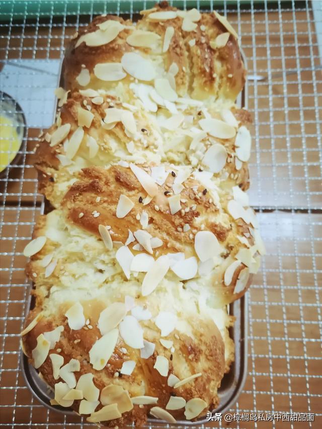 2、中吐司用180度烤30分钟。在发酵后刷蛋液,装饰表面后烘烤。