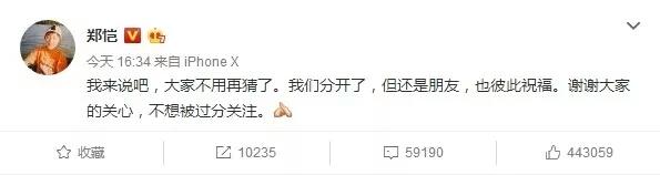 今天郑恺发博承认与程晓玥分手,在微博中写到“我来说吧,大家不用再猜了。我们分开了,但还是朋友,也彼此祝福,谢谢大家的关心 ,不想被过分关注”还是要为郑恺的这份洒脱打call