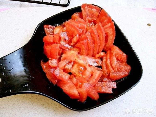 3. 将西红柿用刀剁碎。一定要剁碎,这样炒出的西红柿比较细腻,更容易给菜花上色。