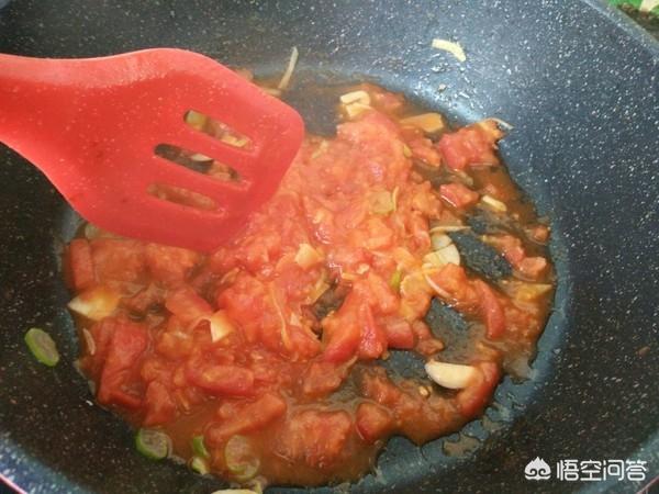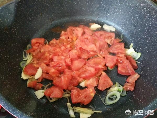 8. 锅中倒油,放入葱花炝锅,然后倒入西红柿丁、胡萝卜片翻炒。炒的时间一定要长点,将西红柿炒成泥状,充分融化。