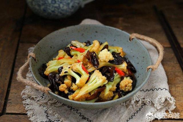 最后注意的就是盐要少加,因为这道菜里的蚝油和酱油已经很咸了,而且又是干炒没有加水,所以根据自己口味酌情添加。最后的翻炒时间要短,时间长了花菜就会发苦,木耳也会被炒干的。