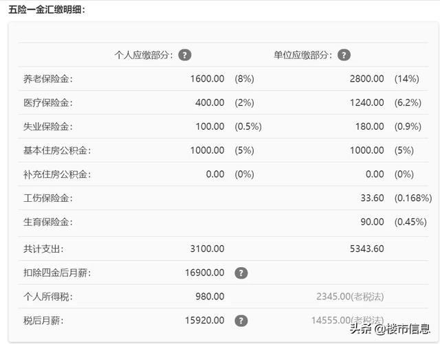 按照公积金和社保都以税前20k基数缴纳,那么这位拿到20k税前薪资的同学,五险一金及个人所得税的缴纳情况如下图: