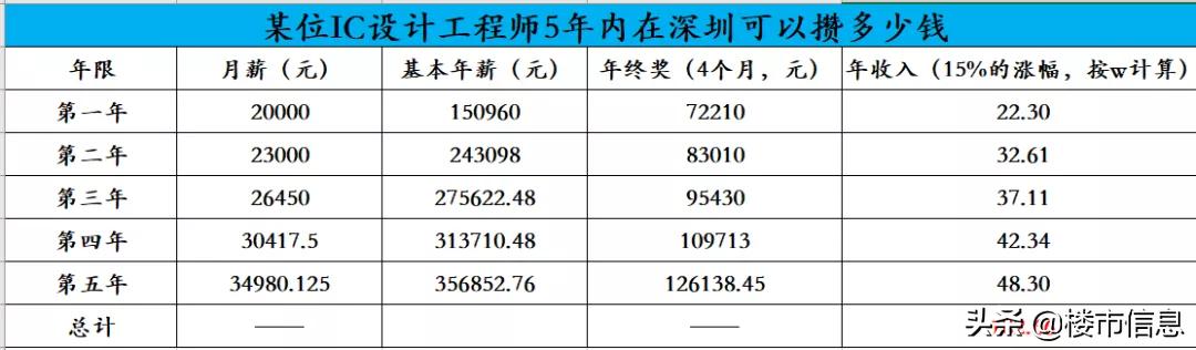 故该同学毕业第一年的收入约为12580*12+72210元=223170元(约22.3w)。假设每年调薪比例是15%,年终奖仍旧为4个月,仅考虑最普通且没有跳槽的情况下,粗略估计该IC设计工程师的五年收入如下: