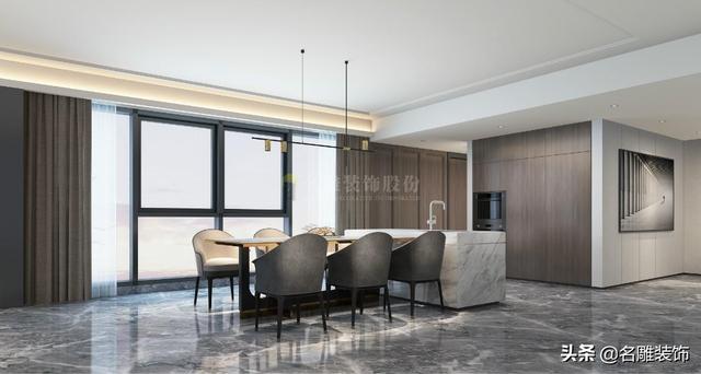 餐厅空间宽敞明亮,同样做了大面积的落地窗设计,餐座椅子用的是和客厅同一套系,延续客厅的高级灰纹理大理石瓷砖,天花上设计的灯带与餐桌上的极简约吊灯,是打破整个空间沉闷感的关键元素。经过了一整天的忙碌,我们更想在一个安静、舒适、宽敞明亮的环境中生活,来消除视觉的疲劳,忘记都市的喧嚣,享受生活的宁静。