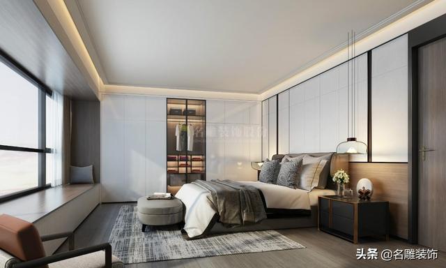 主卧的设计整体色调上用的是简约风的色调,但是不同于客厅与餐厅,比较偏温馨舒适,灰色元素使用的较少,纯天然的原材料的木地板使得空间更加的自然和干净。没有多余的装饰,简单的物件陈设,线条也简单,整个室内空间就是一种大方温馨的视觉感。
