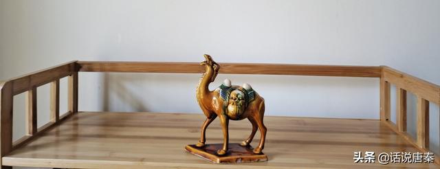 这件唐三彩双峰骆驼,仰天鸣叫,似乎跋涉跋涉在大漠上,鞍子上还有胡人头像,这不禁让我们想到著名的古丝绸之路。和平使者走在去西域的路上,洒下一路驼铃声。