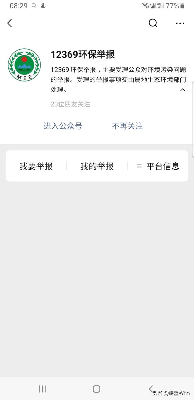 第二:12369环保举报平台,和12369环保举报热线不同,生态环境部门简称的微信举报。这里举报首先要在微信里面搜索12369环保举报公众号,关注