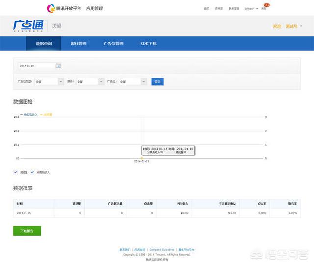广点通联盟管理可进行数据查询,媒体管理,广告位管理以及SDK下载。