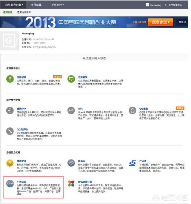 登录open.qq.com后,进入管理中心首页,选择相应的应用进入应用能力列表,在系统能力支持一栏可看到“广告联盟”按钮。如下图:
