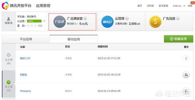 登录open.qq.com后,进入管理中心首页,选择相应的应用进入,即可看到“广点通联盟”按钮。点击“广点通联盟”按钮即可。如下图所示: