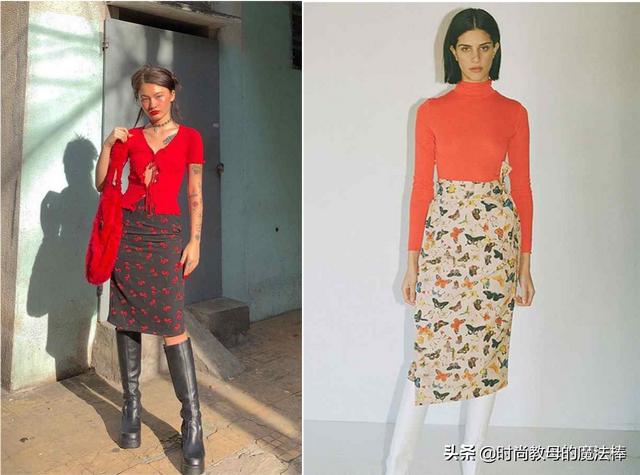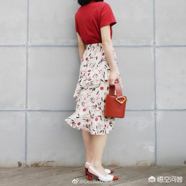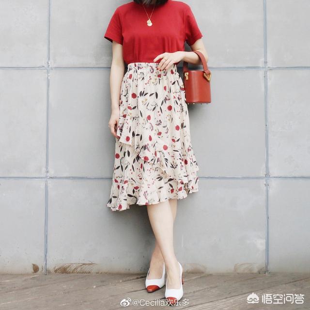 红色代表着热情与快乐,搭配方案很多,在此推荐一种,用浅色印花半身裙来调和热度,达到清爽的效果