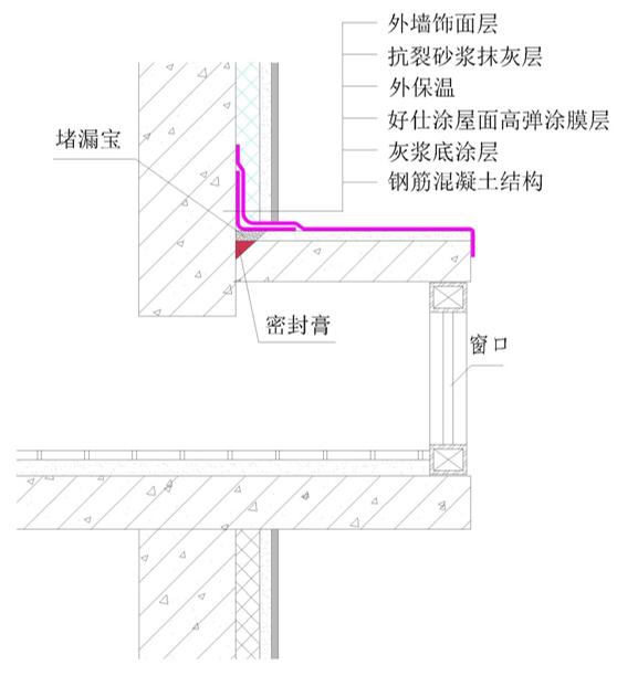 飘窗的顶板不是与主体一起浇筑的,而是在主体完成后,再施工飘窗,从而飘窗顶与主体间存在缝隙。若飘窗顶部未做防水措施,或者排水设计不当,飘窗顶板就容易出现渗漏现象。