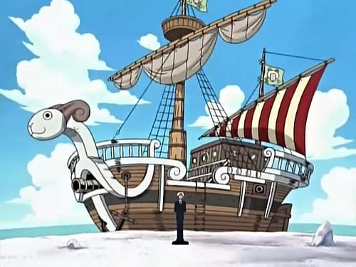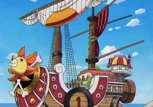 一开始的海贼船名字叫做黄金梅丽号,是一个标准的卡拉维尔帆船,最突出的特征是羊头船首,非常可爱。