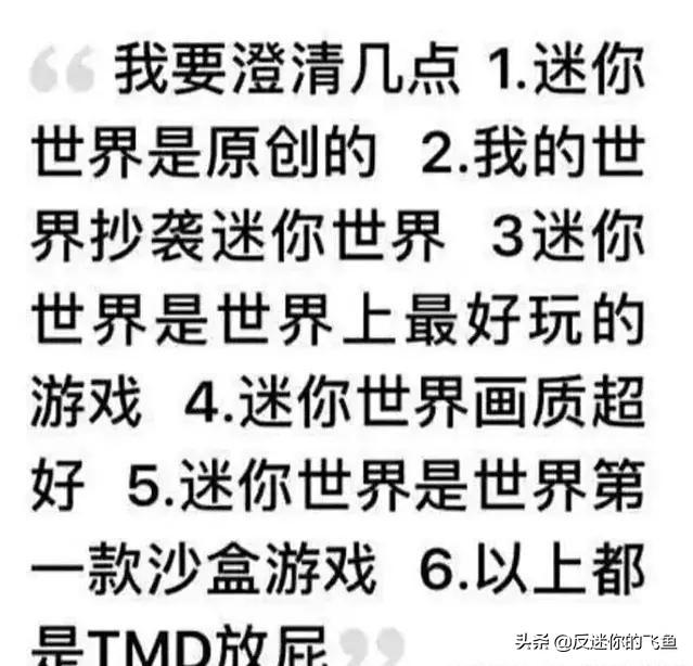 游戏本身我们暂且不谈,单就玩家而言,‘迷你世界’玩家与‘MC’玩家一直争执不断。表面上看起来是对‘抄袭’的争论,实质上是对个别‘不明是非’玩家的讨伐。这群玩家我称呼为‘装睡的人’,因为你永远叫不醒它。