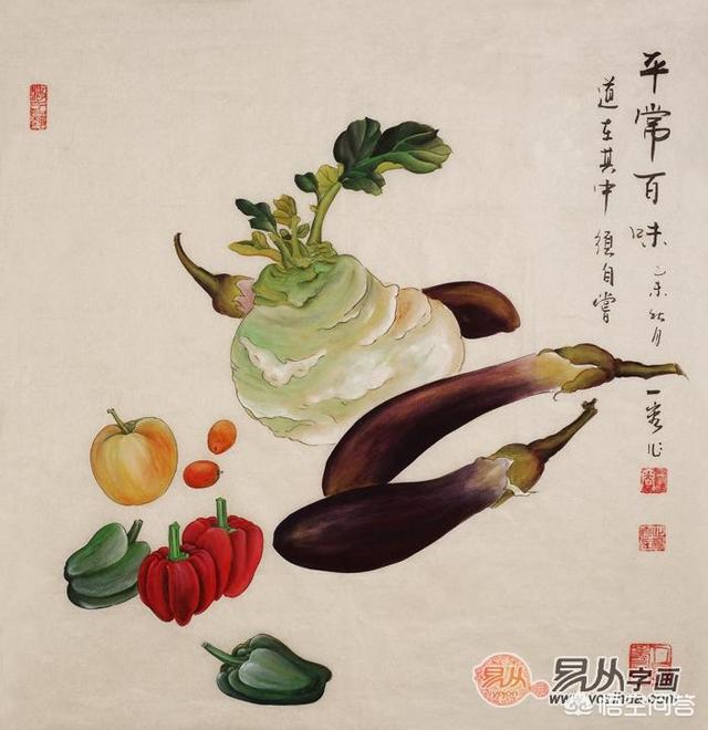 这幅画的主体物是蔬菜,蔬菜本身在我们的餐桌上就是必不可少的,果蔬类的装饰画是餐厅挂画的好选择,清爽安逸,可以增强食欲。水果、花卉和色块组合为主题的画挂在餐厅内也是现在颇为流行的一种搭配手法。