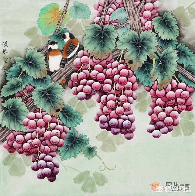 画中的葡萄晶莹剔透,硕果累累挂满枝头。葡萄寓意多子多福,象征着家庭兴旺,多子多福。在国画创作中葡萄代表着丰收、富裕、高贵,成串的葡萄,寓意多多益善、果实累累。葡萄图挂在餐厅象征了丰收,风水寓意非常好。
