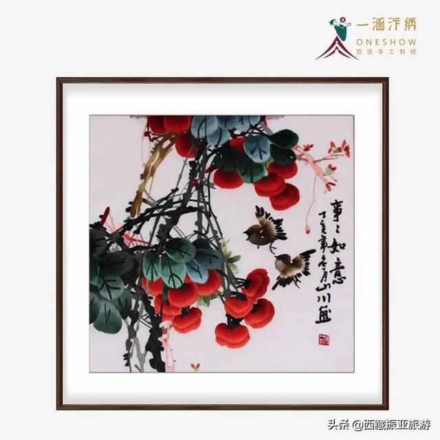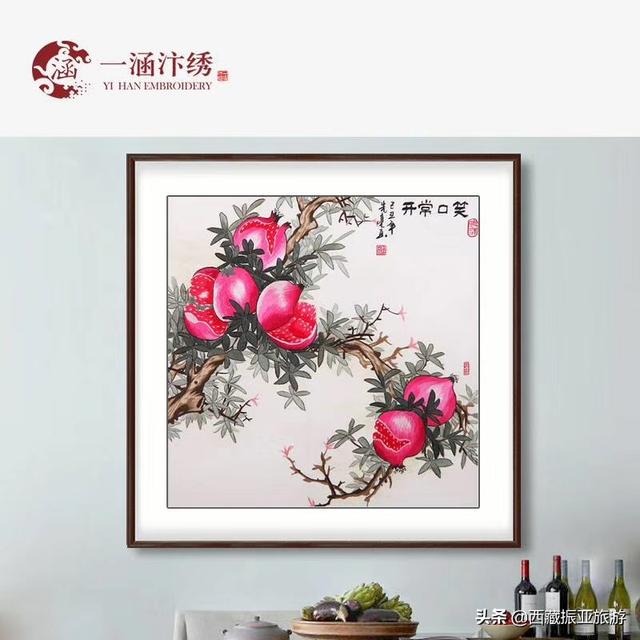 中式装修风格餐厅,可以选择一涵手工刺绣蔬果图,关于餐厅的刺绣事事如意图,秋实图,百财图等,刺绣色彩靓丽,挂在餐厅,促进食欲。