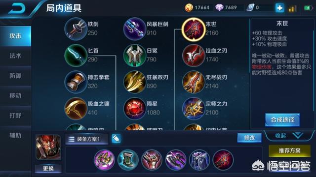 - 如果想要选择典韦打野的话建议使用这套出装,优先做出二级肉打野刀,在做出鞋子之后升级巨人之握也就是三级肉刀,被动的献祭可以不用出火甲。之后做出核心装备反甲,做完了反甲可以考虑补一键输出装暗影战斧,之后出魔女最后一件出破军或者末世都可以。不过这种玩法在高分段还是不建议使用的。