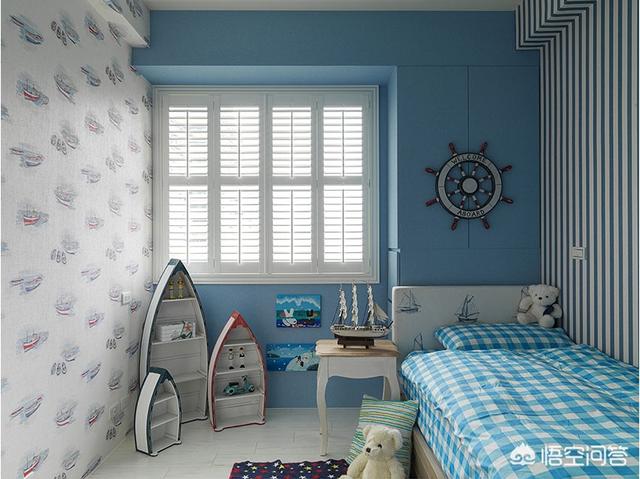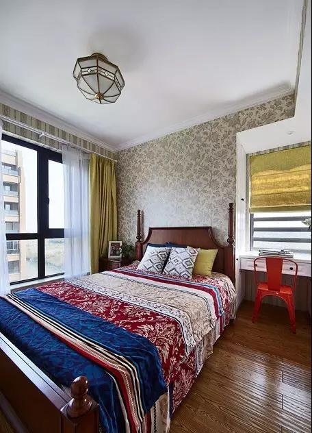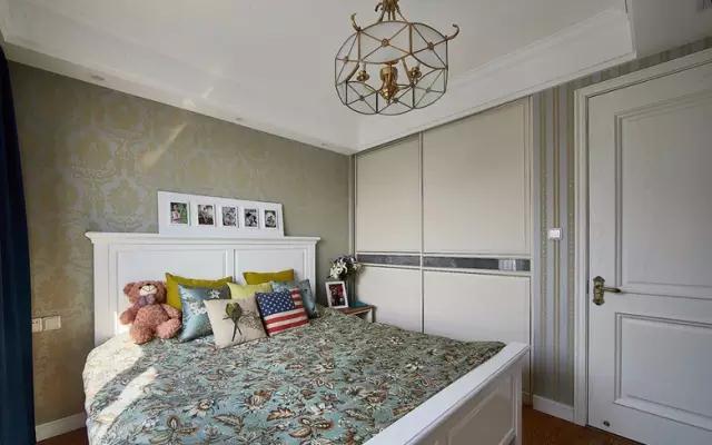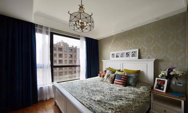 ▲ 主卧用了两种不同的壁纸铺贴,配以蓝色帘子白色纱。