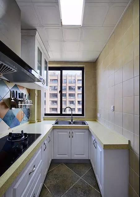 ▲ U字形橱柜,白色模压橱柜配上有点泛黄的石英石。