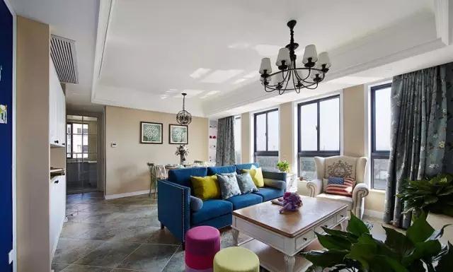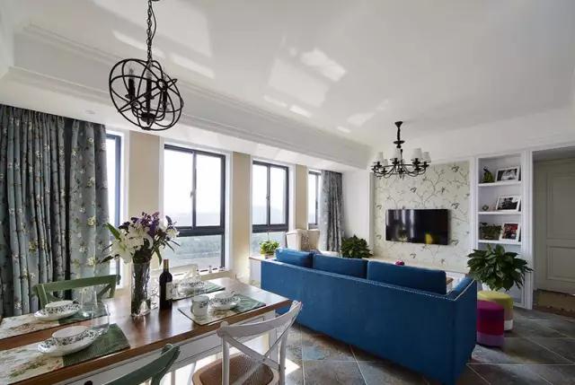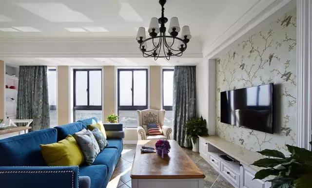 ▲电视背景用了花鸟纹壁纸,蓝色布艺沙发很亮眼,同时充当和餐厅的隔断。
